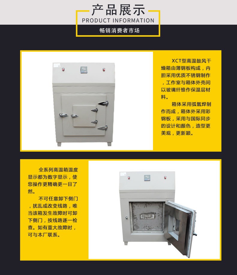 1.XCT型高溫鼓風(fēng)干燥箱由薄鋼板構(gòu)成,內(nèi)膽采用優(yōu)質(zhì)不銹鋼制作,工作室與箱體外殼間以玻璃纖維作保溫層材料。