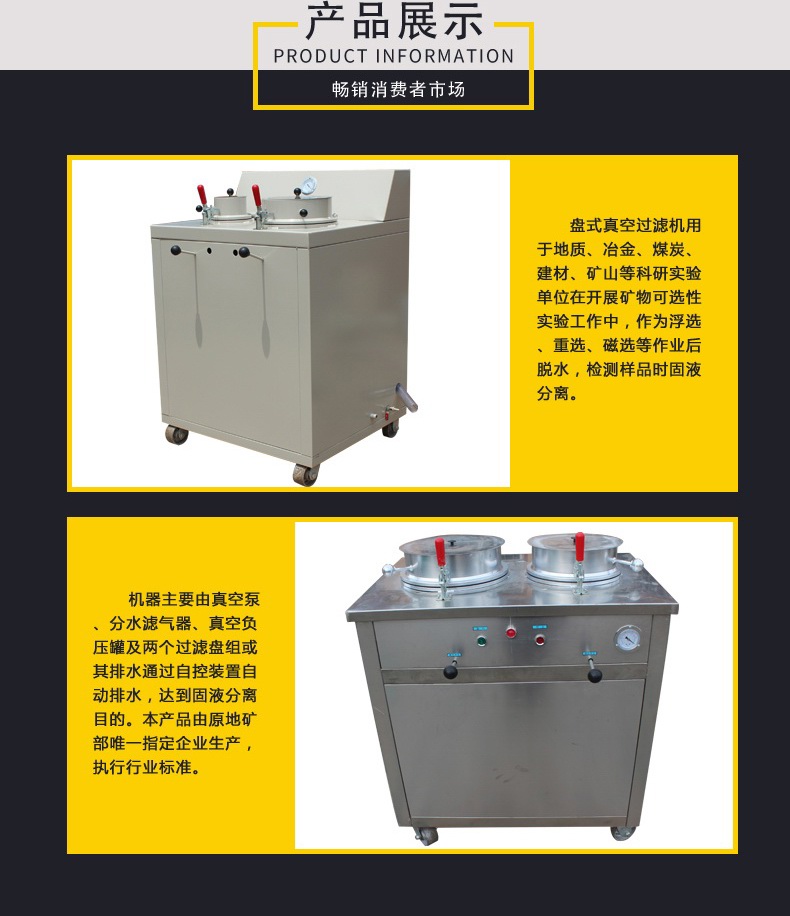 本設備由機箱,小濾盤,抽排管道,補加水管道,移動抽濾盤,電器,真空泵,真空罐等部分組成。