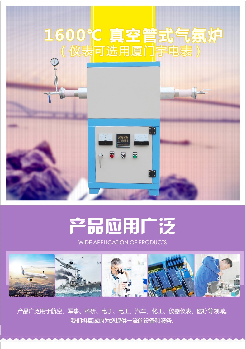 本系列真空管式氣氛爐為周期作業時,額定溫度為1600℃,供實驗室、科研單位、工礦企業做在低真空狀態下或氣氛保護下熱處理加熱之用。